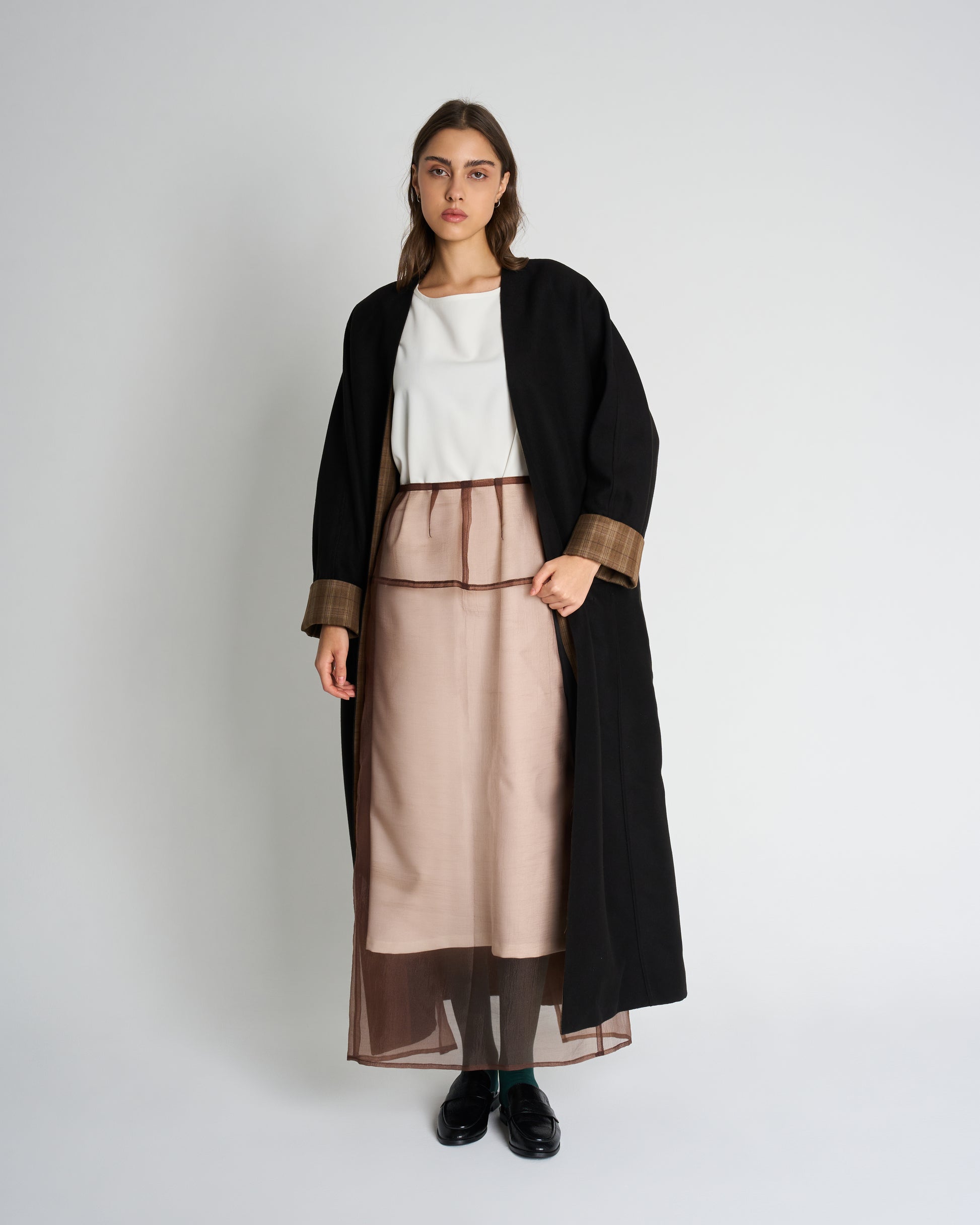 - Three-piece layered set: oversized bisht with inner dress and detachable sheer skirt.