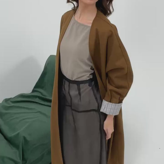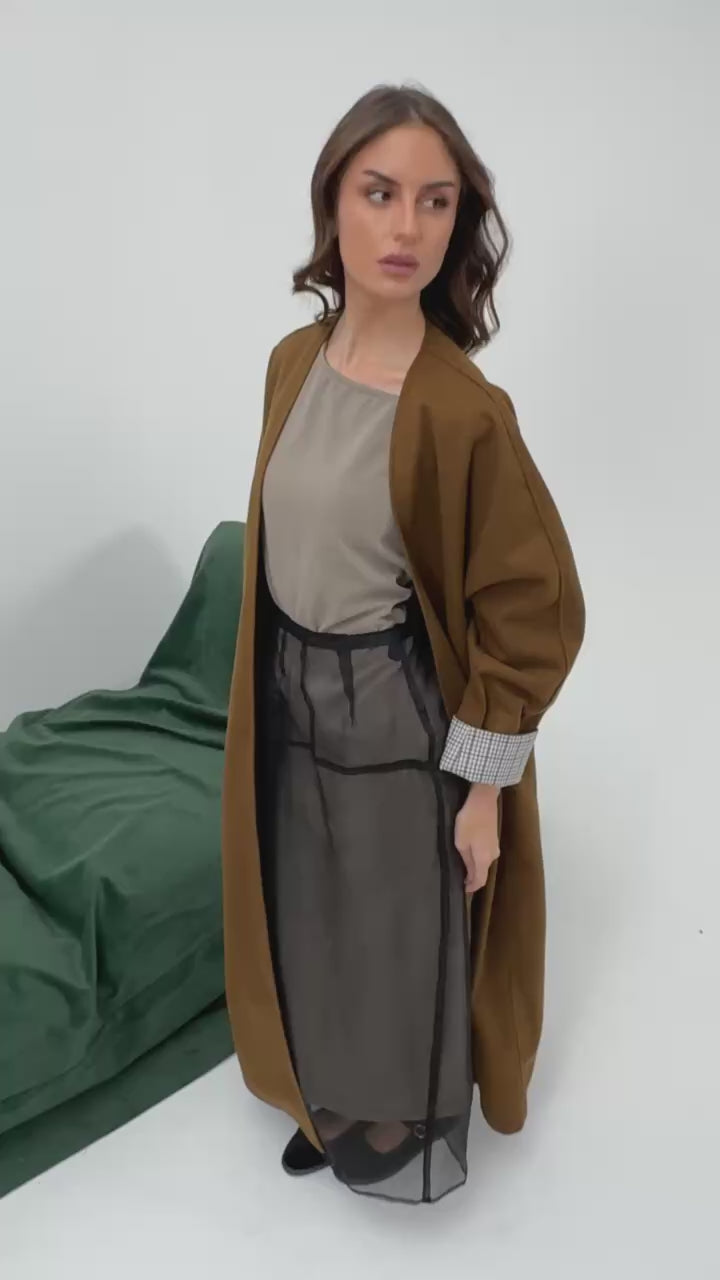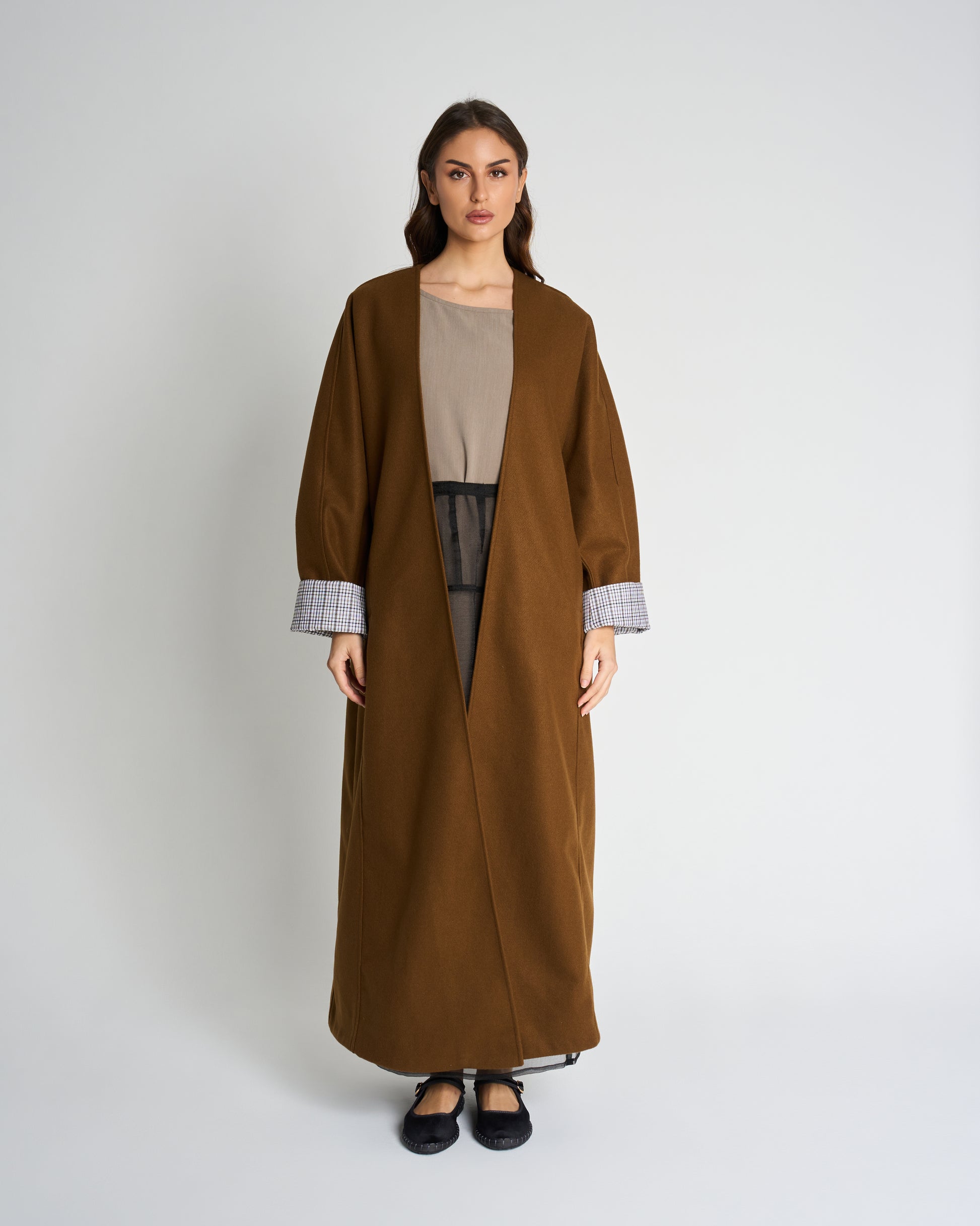 - Oversized bisht in wool with wide contrasting plaid cuffs.